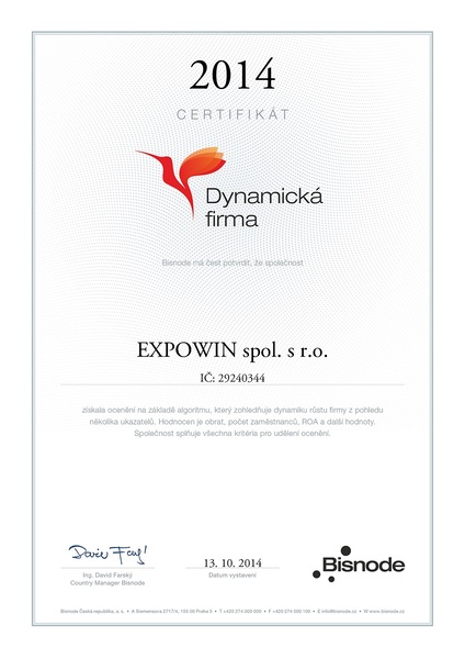 chceme Vám touto cestou poděkovat, protože především díky Vám a Vaší spokojenosti jsme získali ocenění „DYNAMICKÁ FIRMA“. Znamená to, že my – ExpoWin, spol. s r. o., jsme důvěryhodná, zdravá firma, která patří mezi 0,001% elitních společností na trhu.