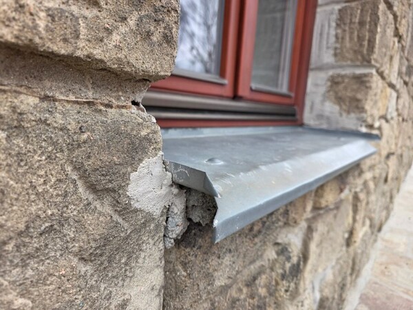b) tenké ohýbané plechy se zahnutými kraji mají tendenci v koncích "pracovat". Fotky natrhlých krajů parapetů a koroze v rozích jsou jasným důkazem, že toto řešení není správné a projevuje se zde mechanická únava materiálu